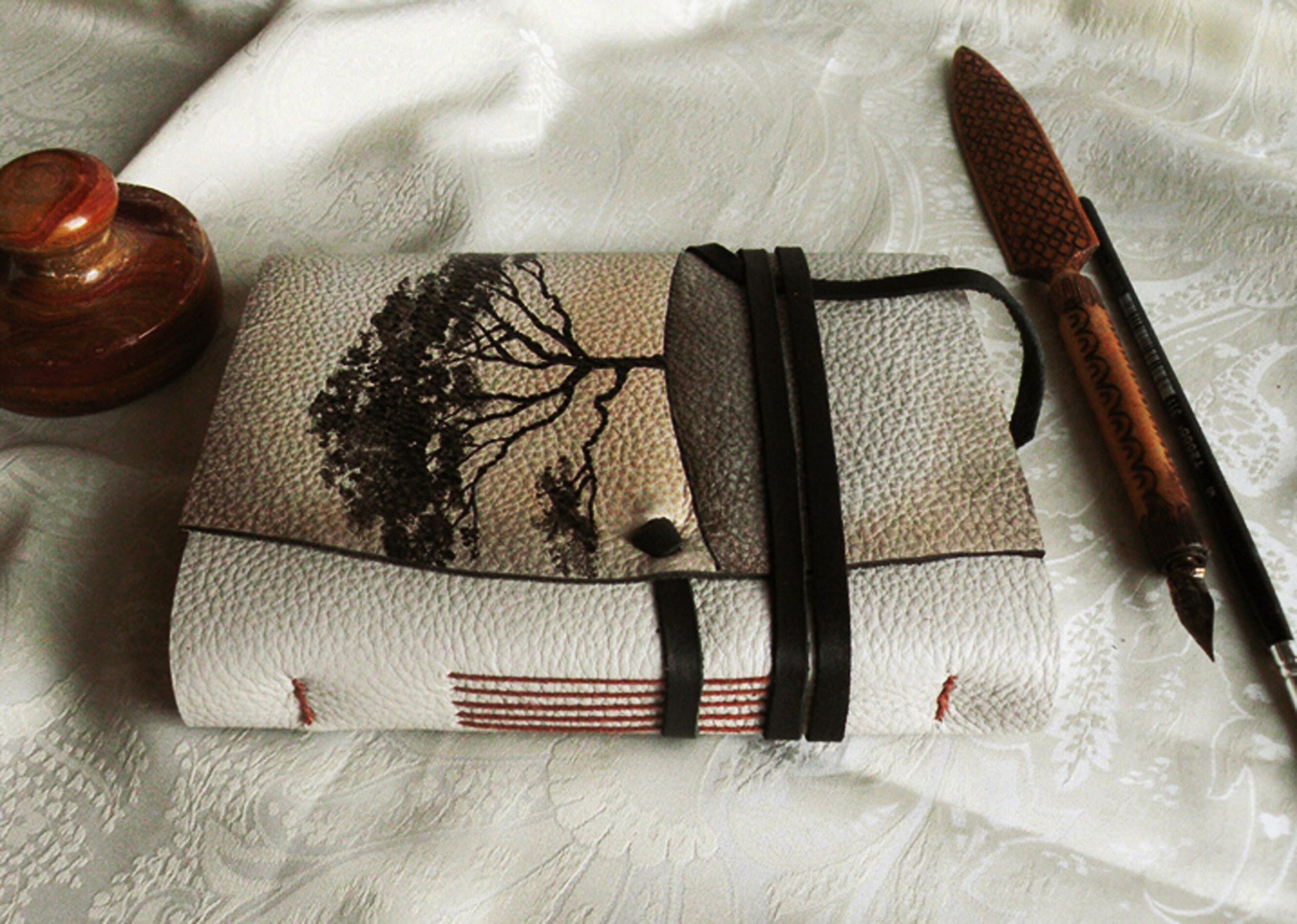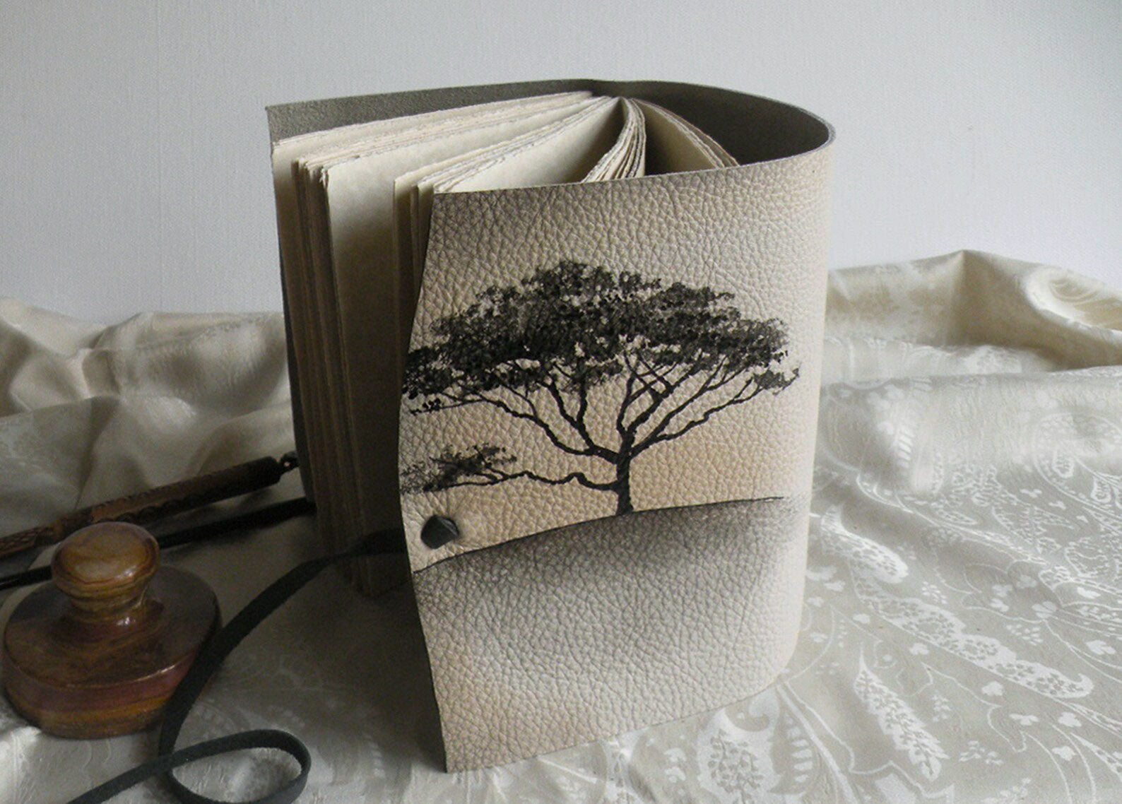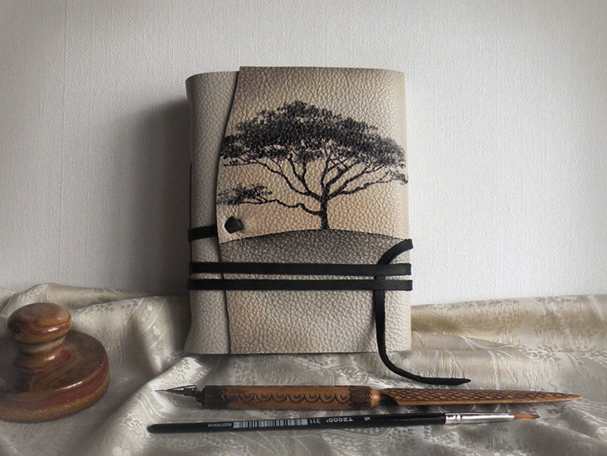 beige leather journal, custom monogram, personalized leather journal with vintage style paper - Mysterious Tree