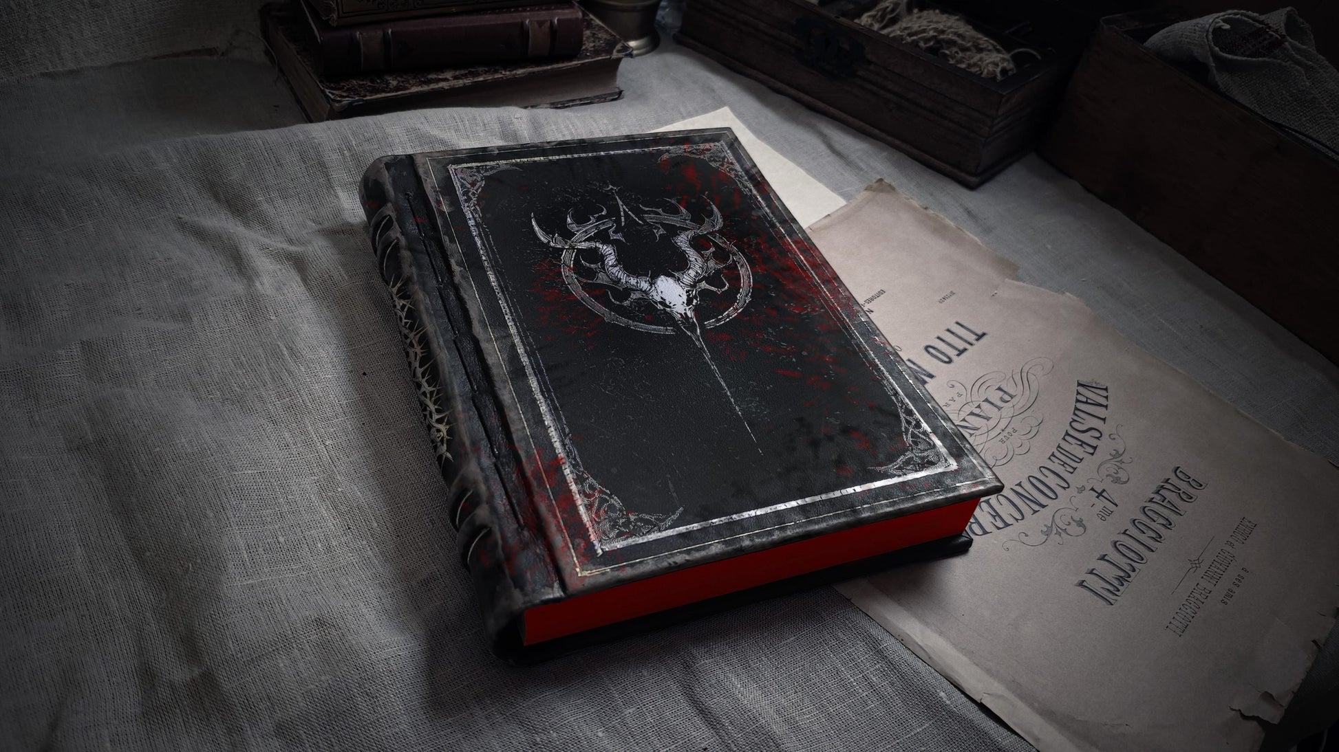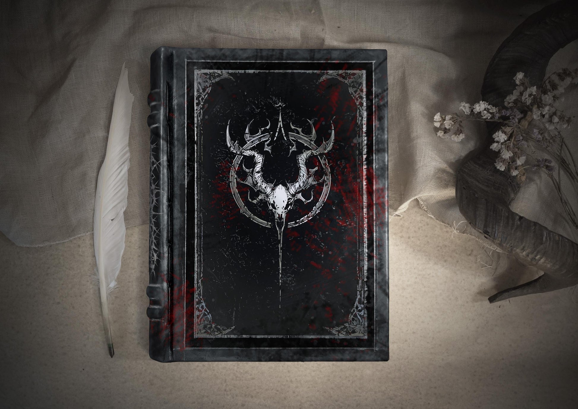 The cover of this impressive tome features a silver design with a mystic encircled horned skull. Splashes of deep crimson accentuate the dark aesthetic, inspired by forbidden rituals and ancient secrets.