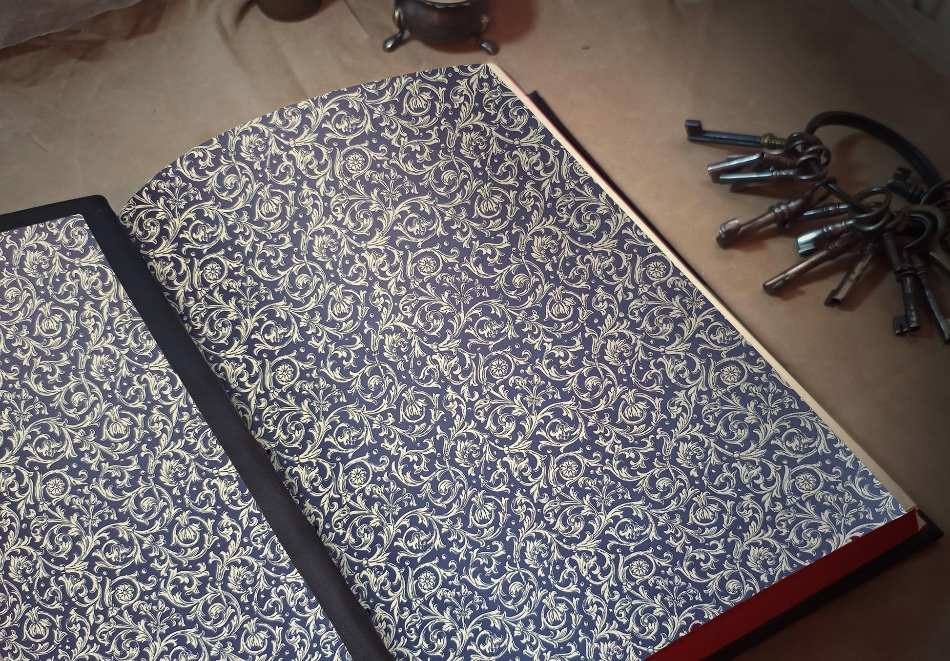 Inside, the 500 pages of smooth, cream-colored paper are an ideal canvas for your thoughts or art. The end pages are crafted from ornate Italian Carta Varese paper, their intricate Renaissance-style pattern providing a striking contrast to the book's dark exterior.