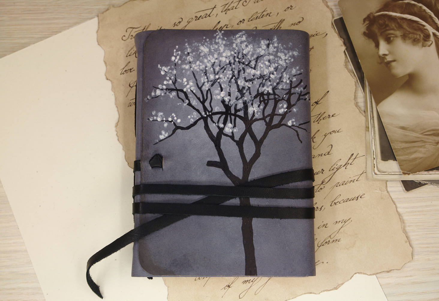 Whether you need a journal to write your good ideas or keep your dreams and memories, this journal will be there for you. It has an lovely cover made of genuine leather. On the cover I painted a blooming tree with special for leather paints.