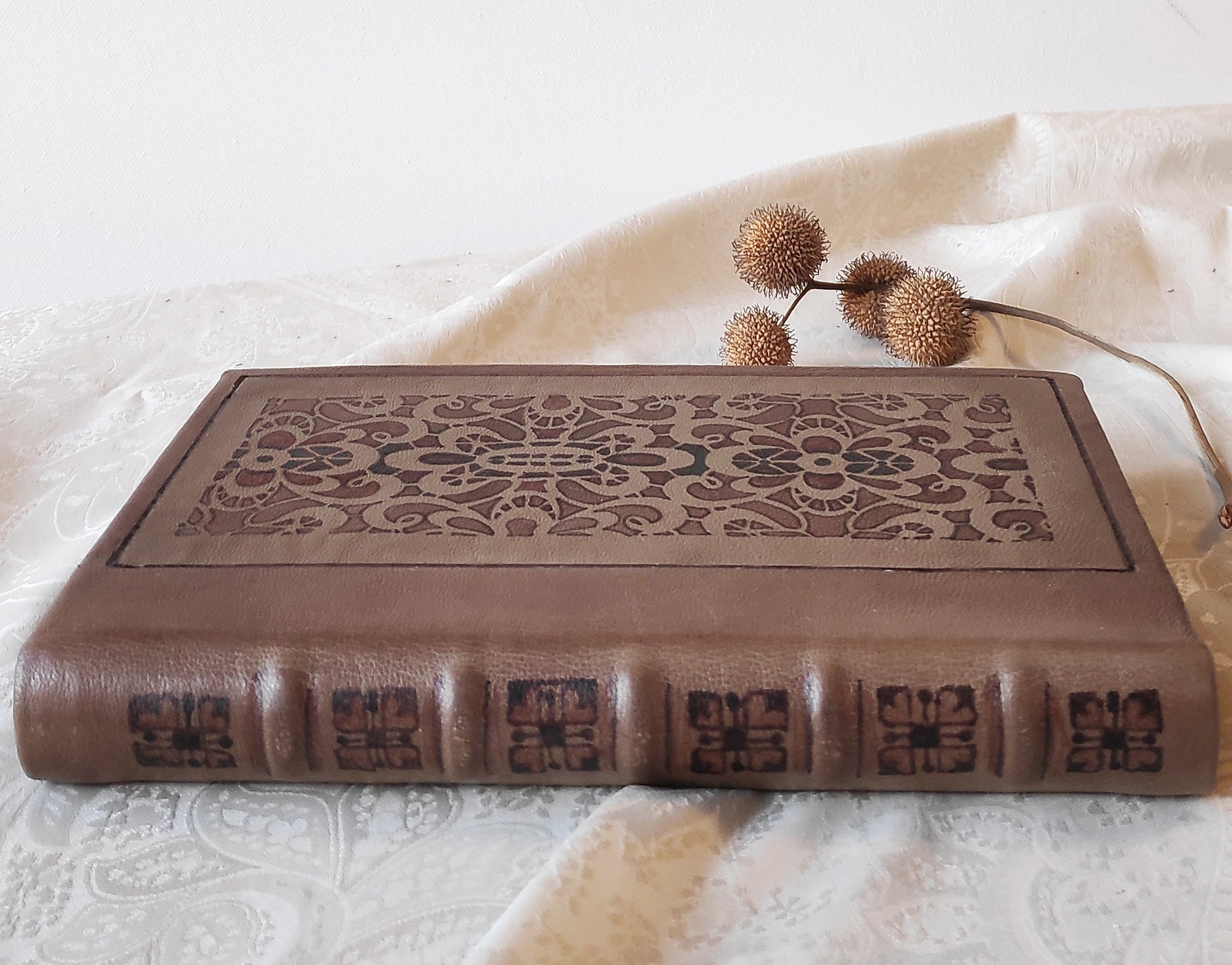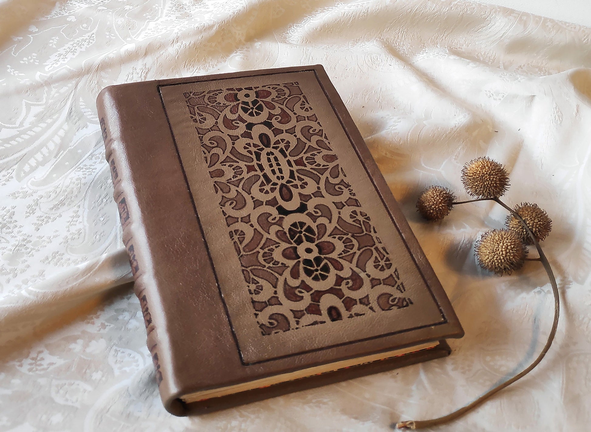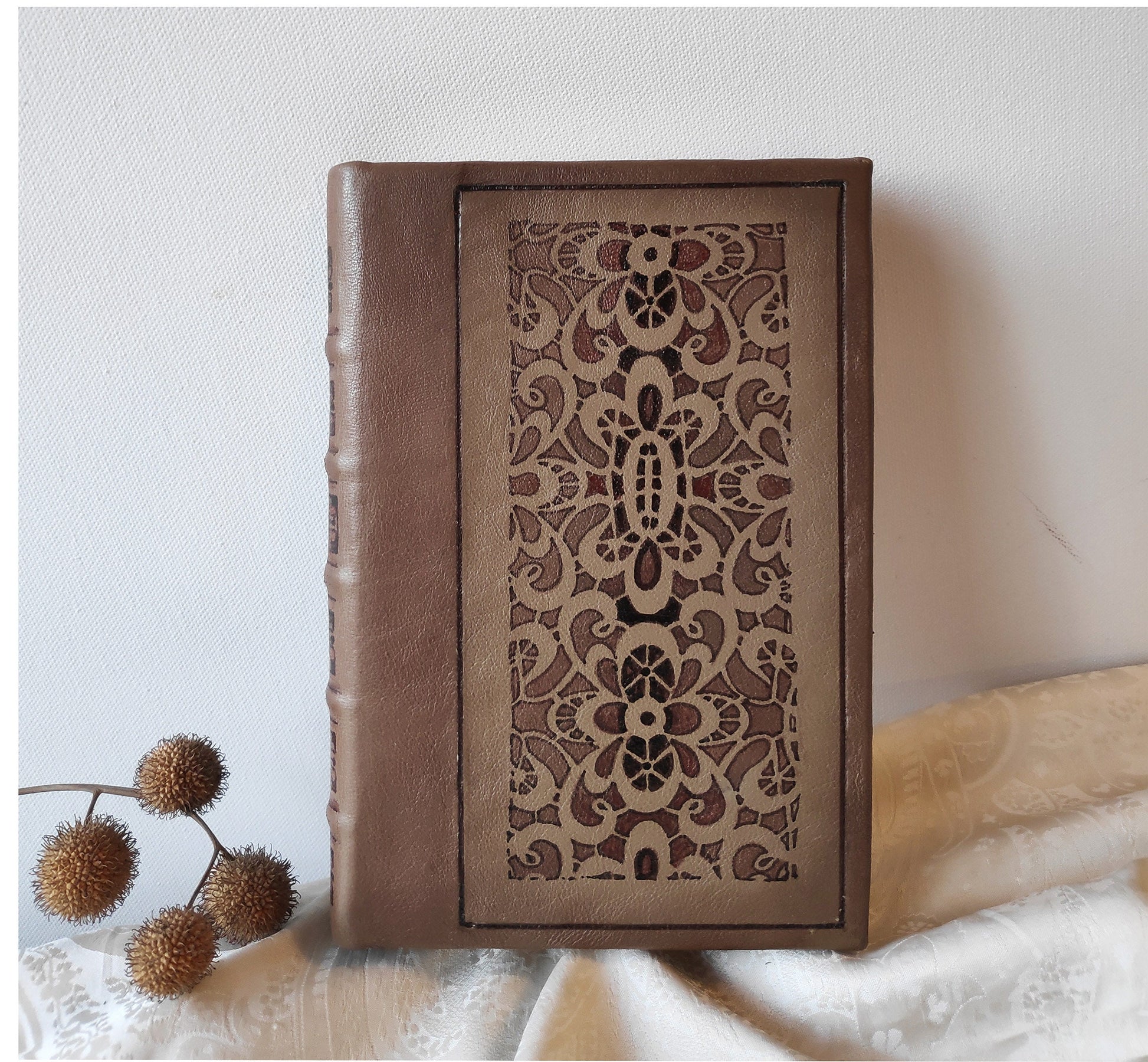 This journal is decorated with leather paints with decorative floral pattern. The leather blank book is made from of Italian quality leather having a lovely texture. It is made in an ancient bookbinding technique and its design reminds of a valuable old books.
