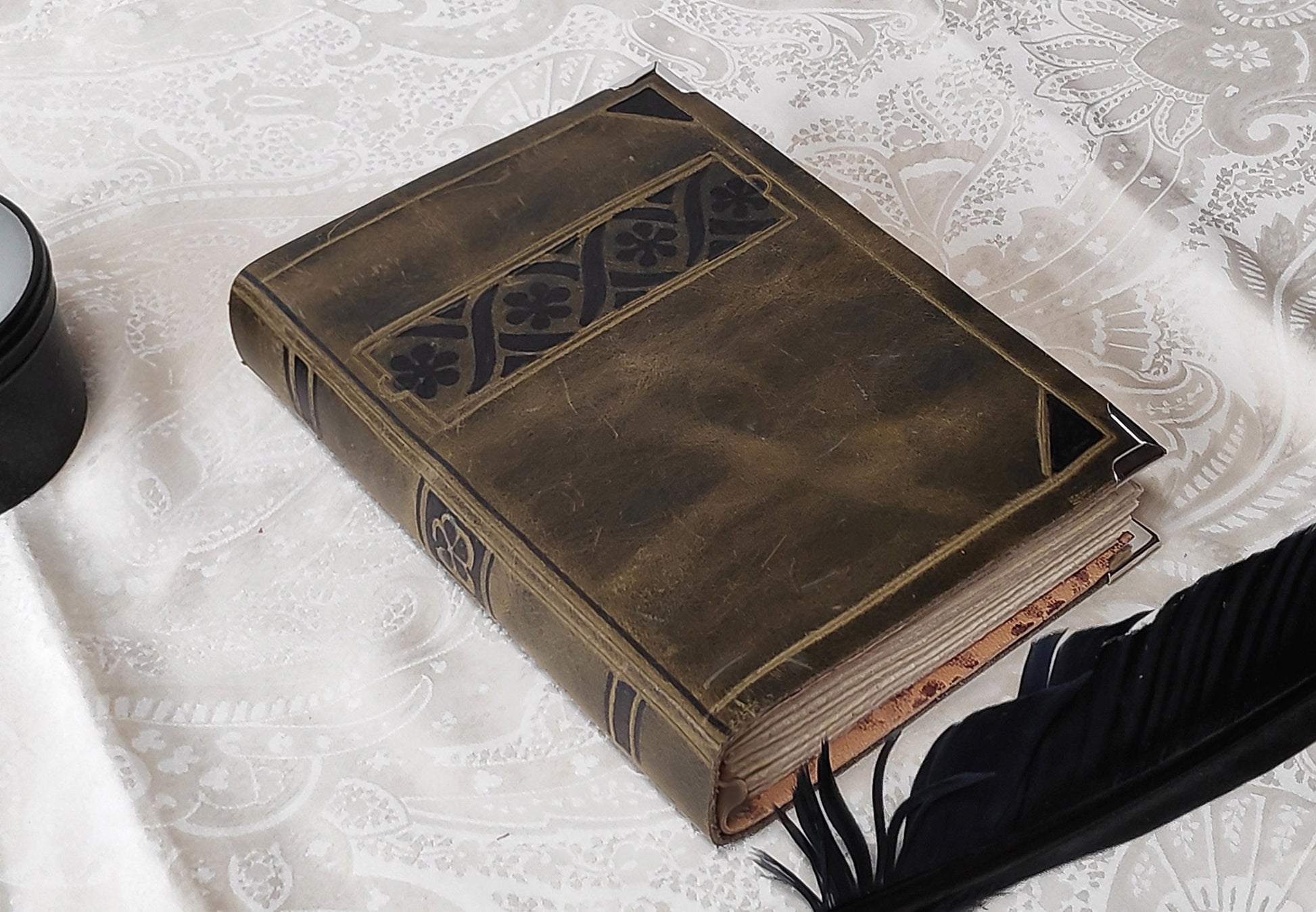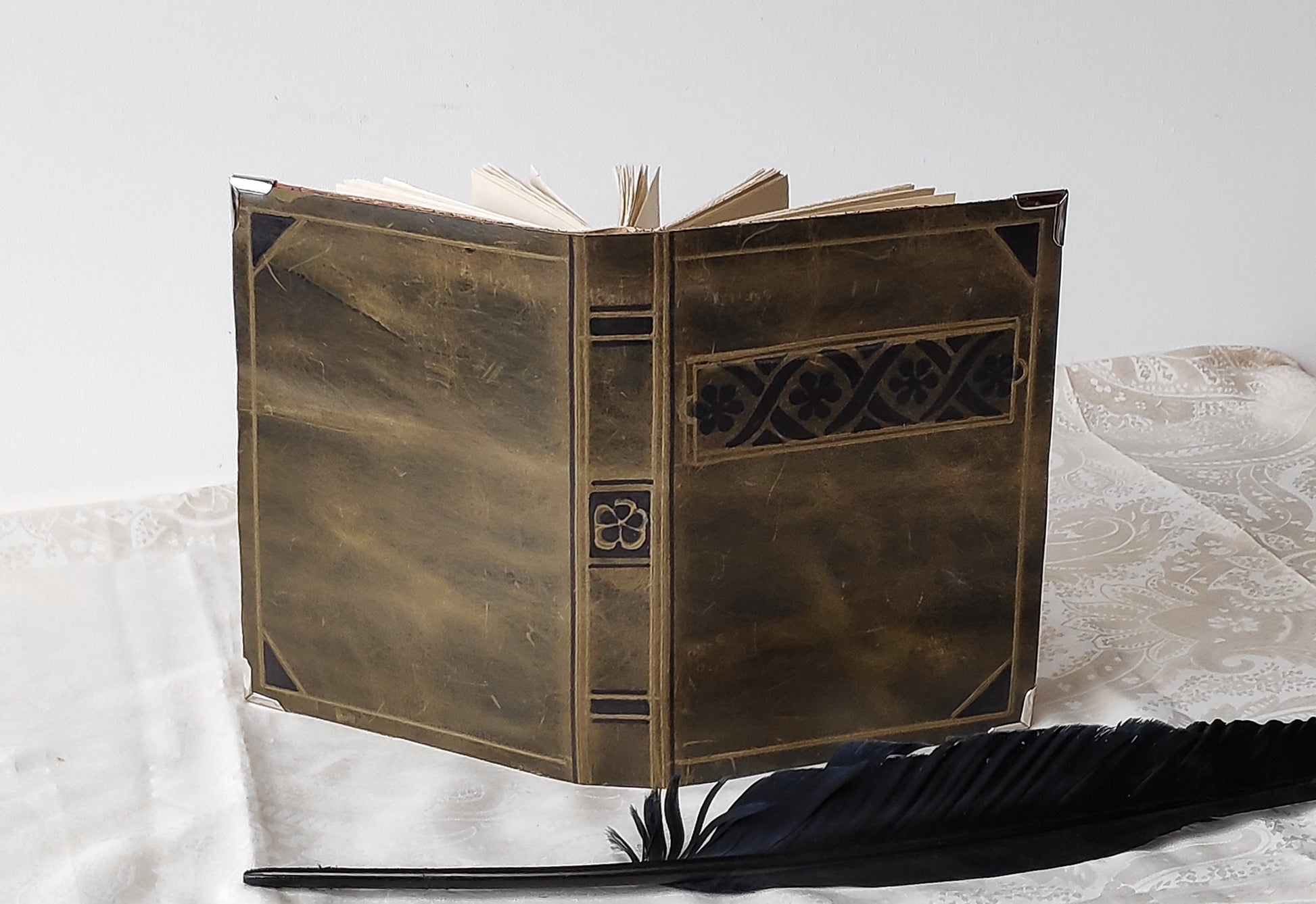 This old looking journal is made of a lovely piece of marbled Italian khaki-brown leather , having a beautiful aged look and a lovely texture. . It was designed to resemble a medieval tome.