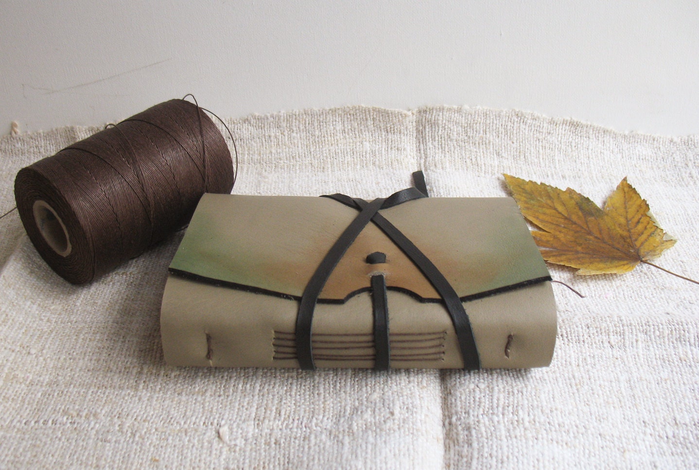 This journal was bound in beige leather with antiqued finish and beautiful texture. I made a subtle patina from green to the color of the rust creating a beautiful gradient.