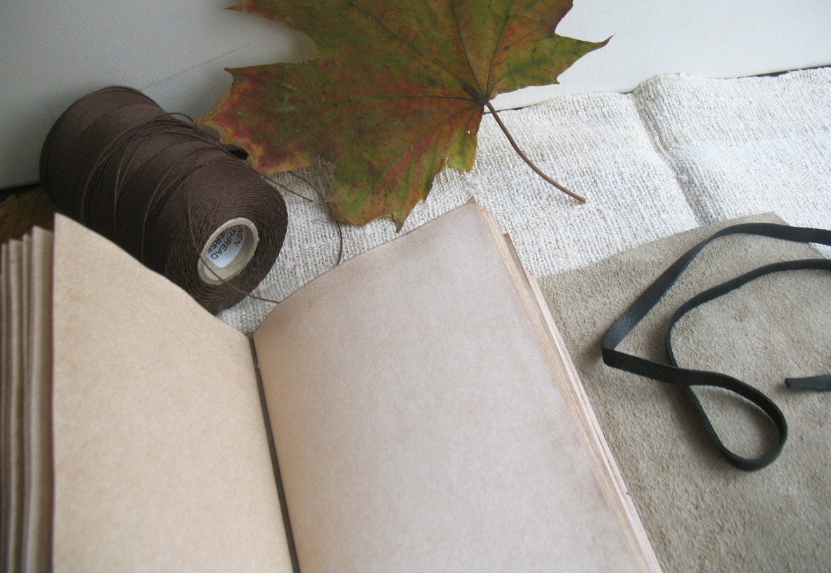 The sewing technique is longstitch, made with strong binding thread. This binding technique allows it to open flat when it use. The journal closes with a black leather tie that wraps around it several times.